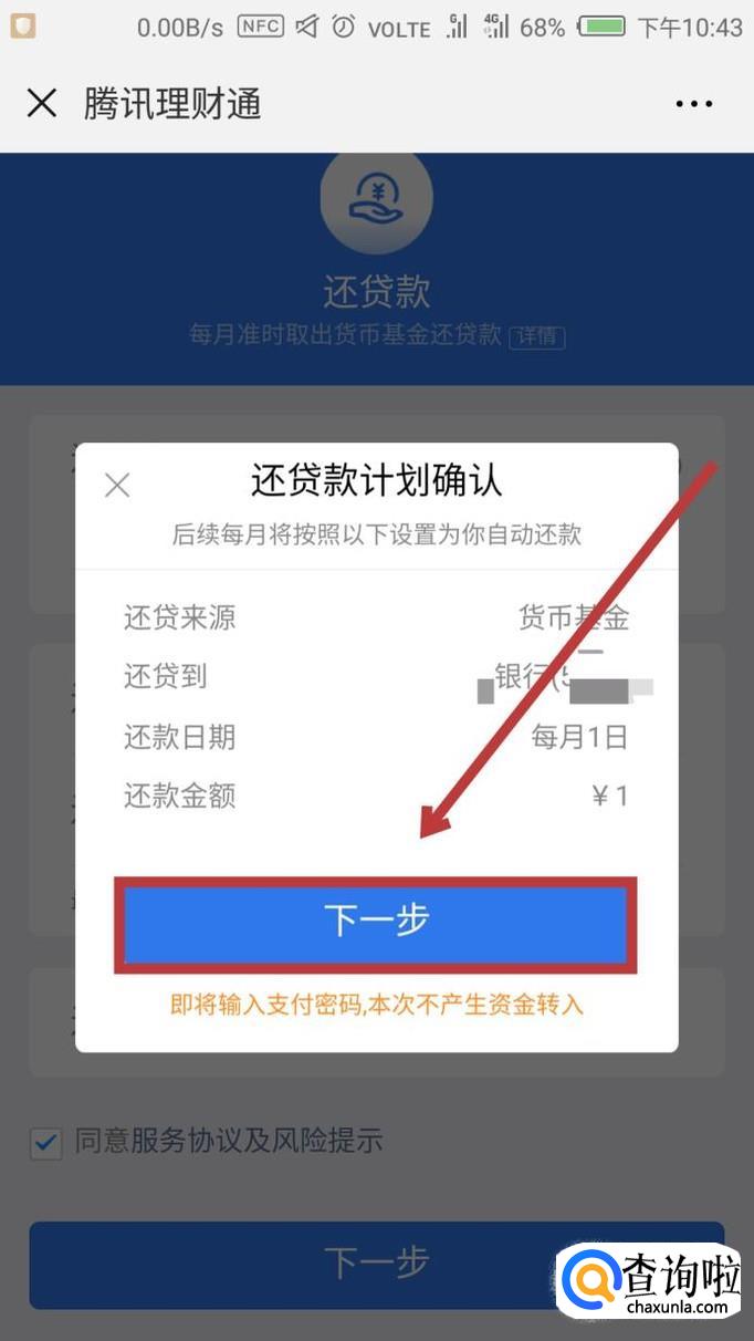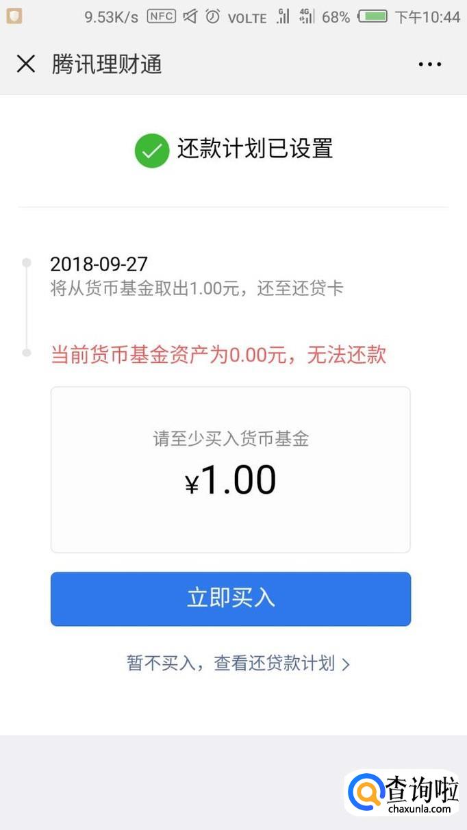 这样还贷款计划就设置成功了,系统会自动在每月的还款日期从理财通的货币基金中取出一部分钱,还到还贷卡里面。