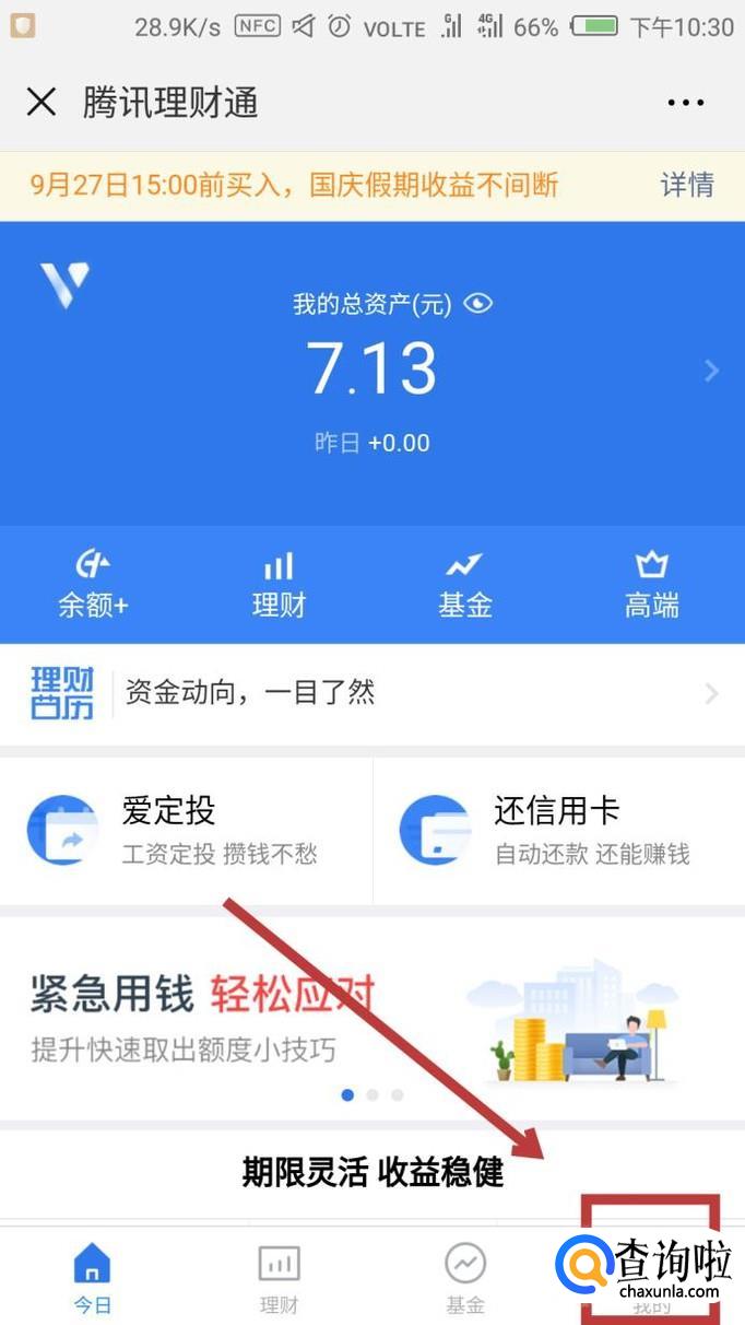 这样就进入到【腾讯理财通】的界面了,在界面右下角找到【我的】,点击进入。