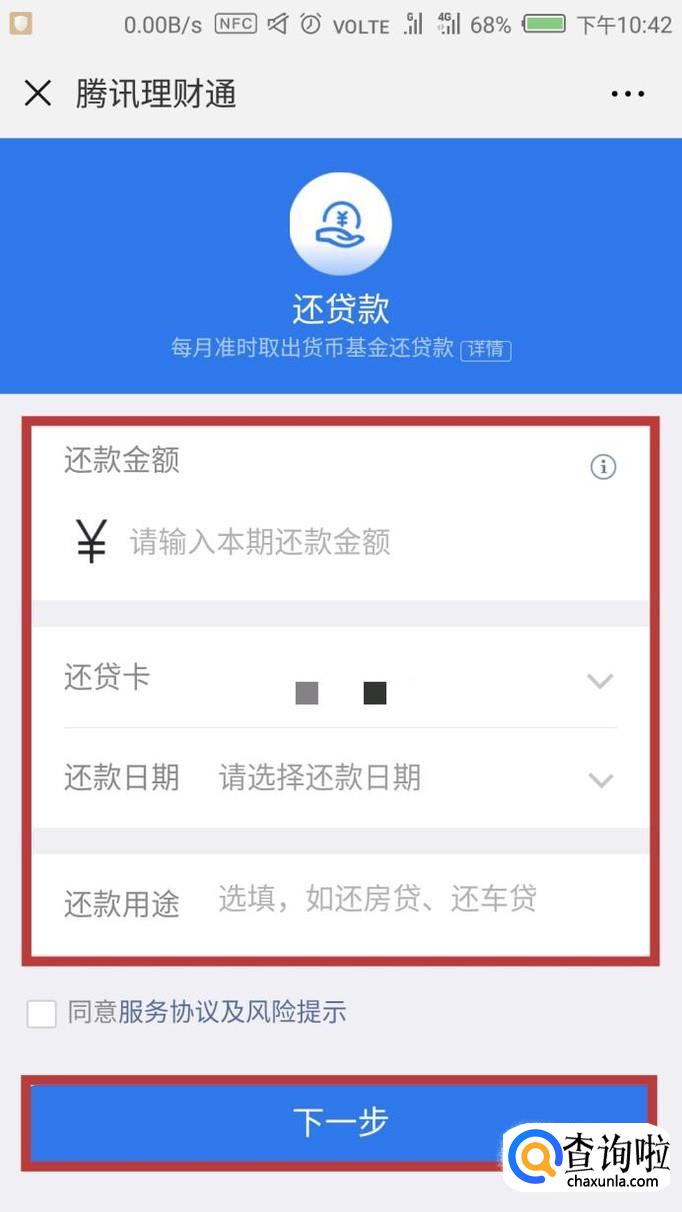然后输入还款金额、还贷卡、还款日期等信息,点击下面的【下一步】即可,如图所示。
