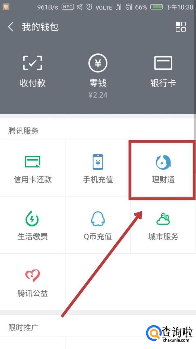 这样就进入到【我的钱包】界面了,在【腾讯服务】下方找到【理财通】,点击进入。