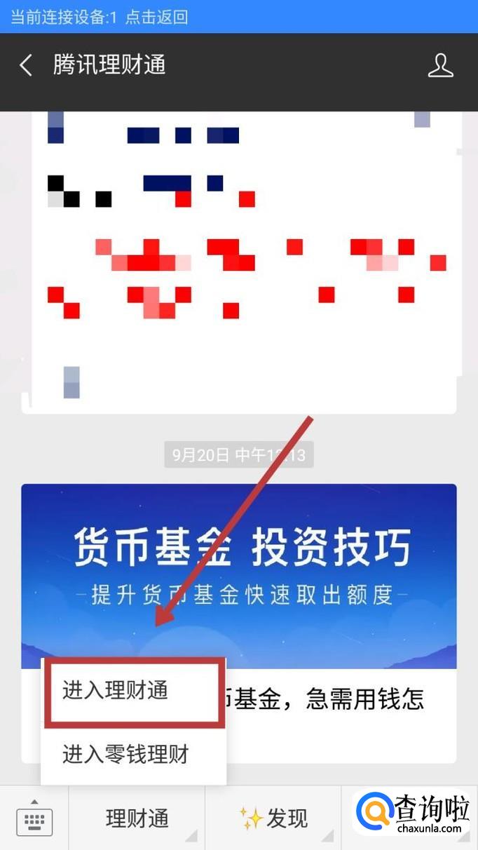 我们也可以通过关注微信公众号的方式进入理财通,如图所示,关注微信公众号后,在下侧的【理财通】中找到【进入理财通】,点击进入即可。