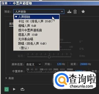 调出操作面板,在预设这里,点拉下按钮,在弹出的各种预设中选择:人声移除。然后点:应用。那么,该音频人声即消除。