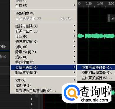 点开效果菜单,在弹出的下拉菜单再点:立体声声像;在右侧的子菜单中再点:中置声道提取器。
