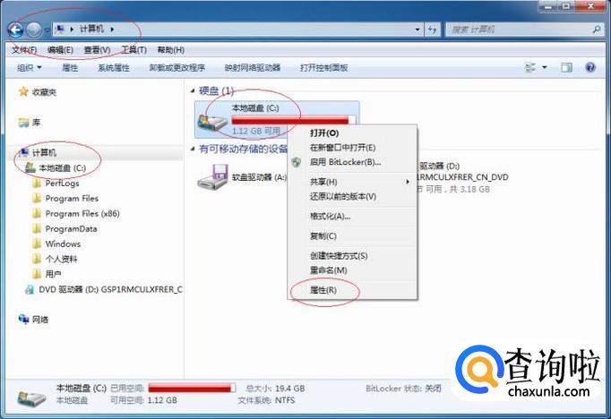 鼠标右击"计算机→本地磁盘(C:)"图标,弹出快捷菜单选择"属性"项。