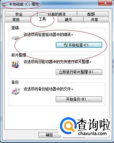 选择"本地磁盘(C:)属性→工具"标签,点击"查错→开始检查..."按钮。