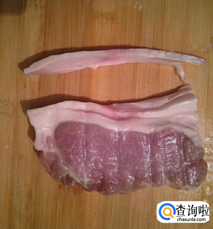 猪肉放水中浸泡一会儿,捞出将猪皮切掉不要,猪皮影响饺子的口感。