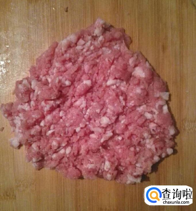 将切成细丁的猪肉剁成肉泥,剁的时候要将肥肉和瘦肉搅拌均匀,刀速要快。