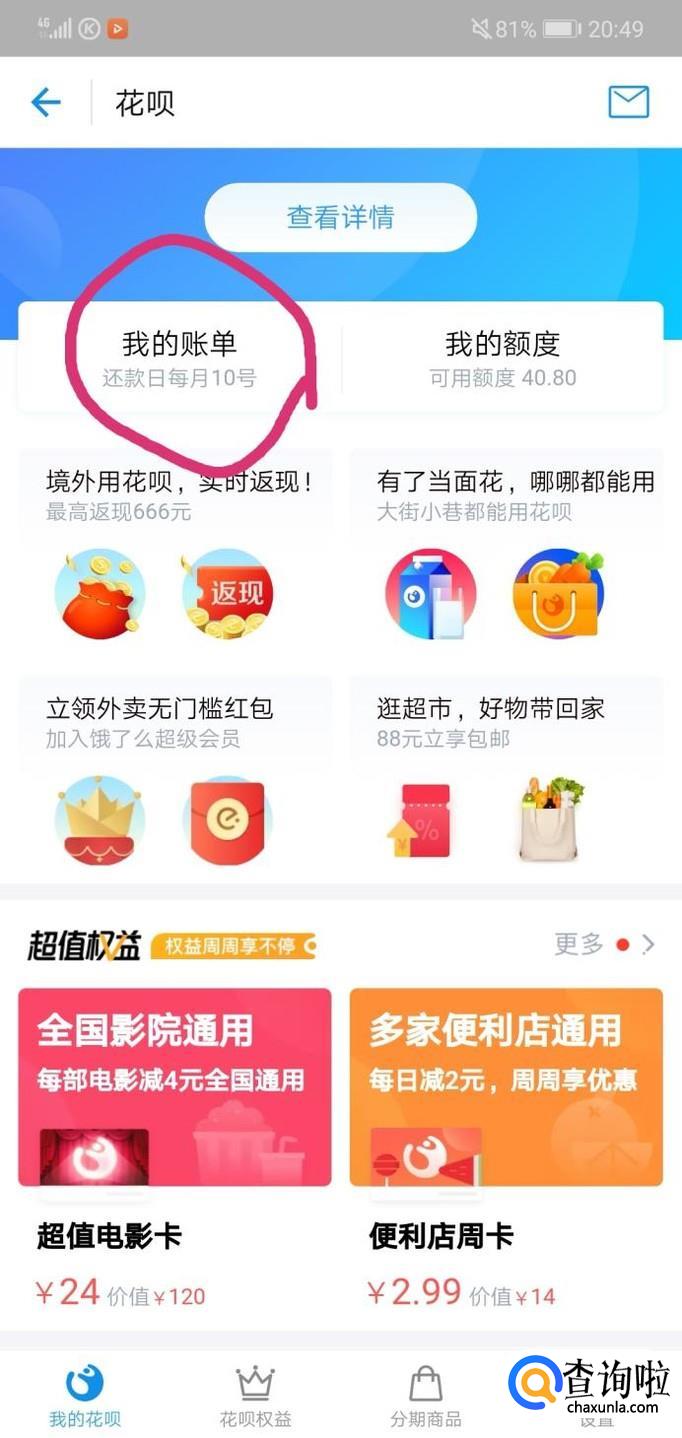 接下来,进入到你的花呗后,找到“我的账单”,点击一下它,这样你就可以进入下一个环节了。