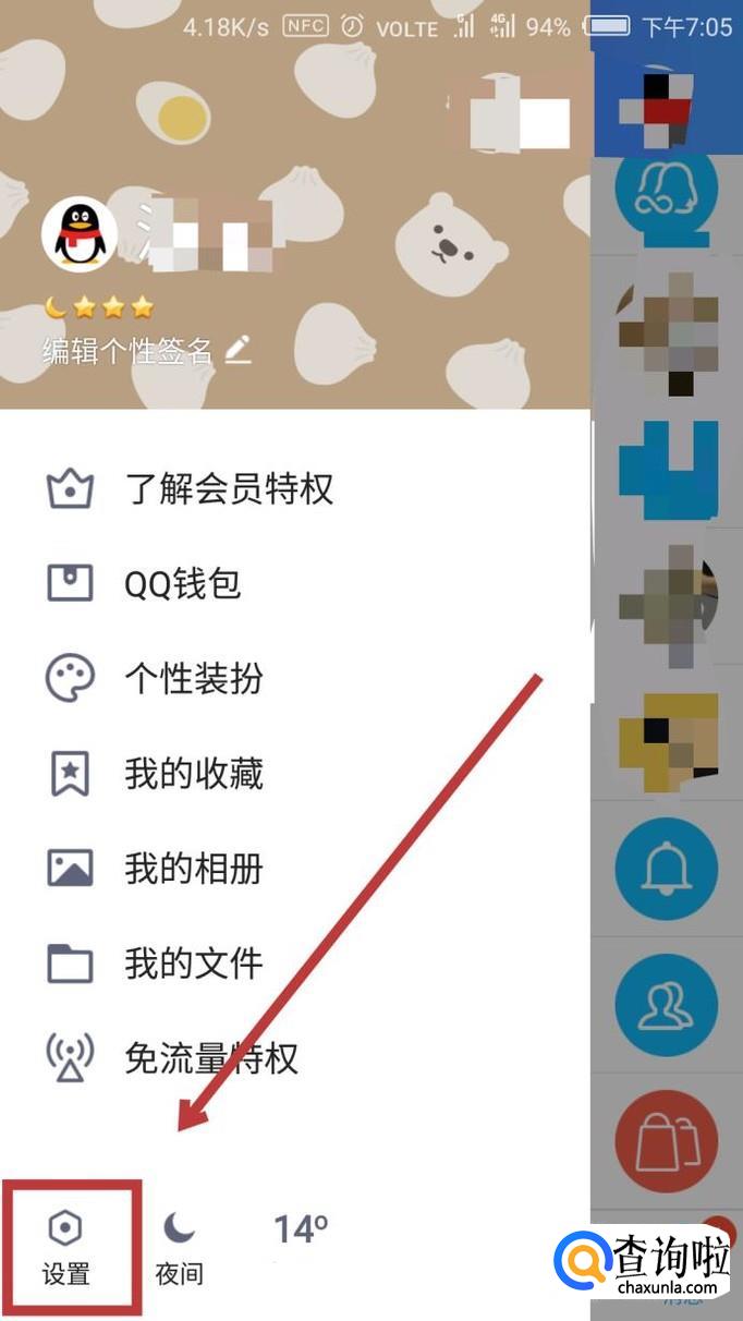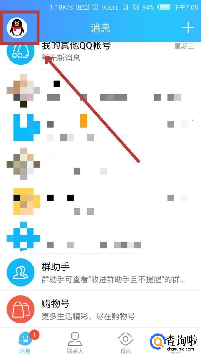 首先让我们打开手机QQ,在界面左上角找到自己的头像,如图所示,点击进入。