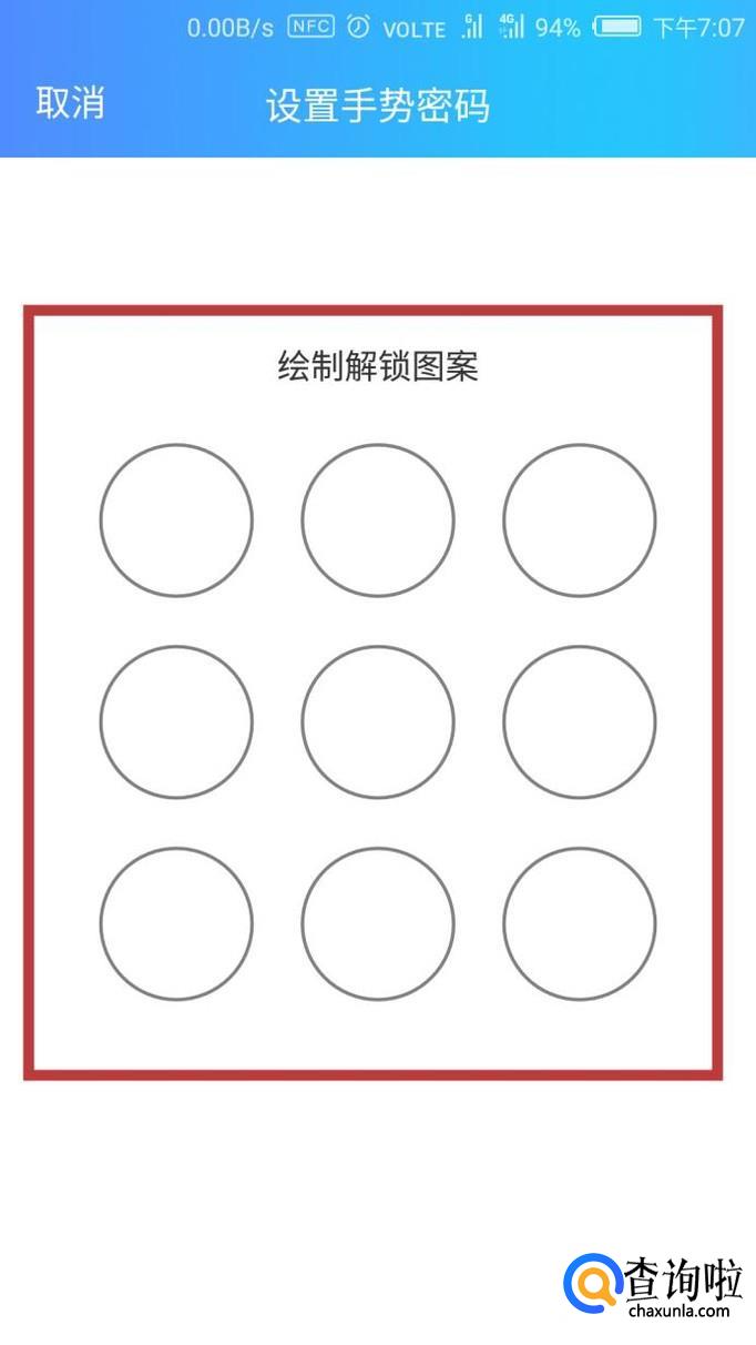 然后绘制一个解锁图案,如图所示。这样我们就成功设置手势解锁了。不过目前只有苹果手机可以进行指纹解锁,安卓系统暂时没法进行指纹解锁。