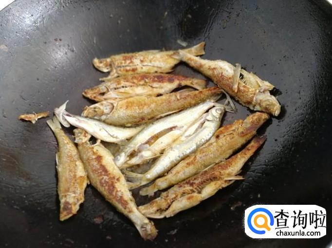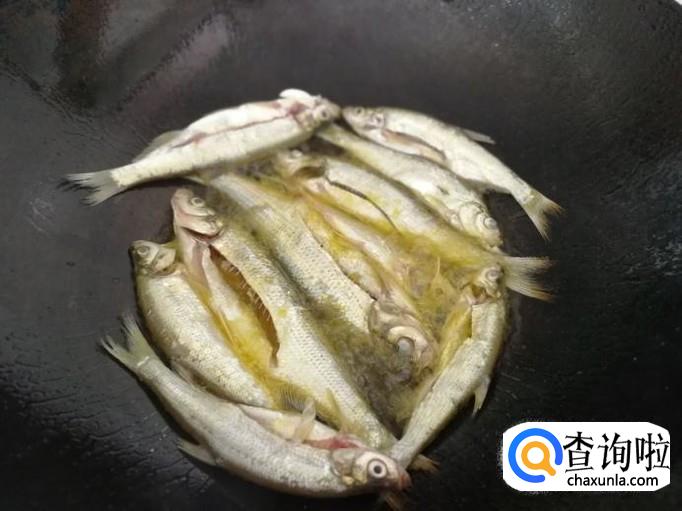 将一面煎至金黄的小鱼翻过来,把另一面也煎至金黄色。