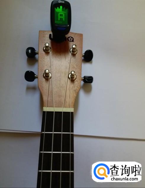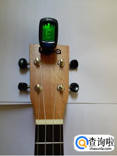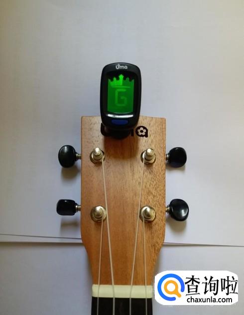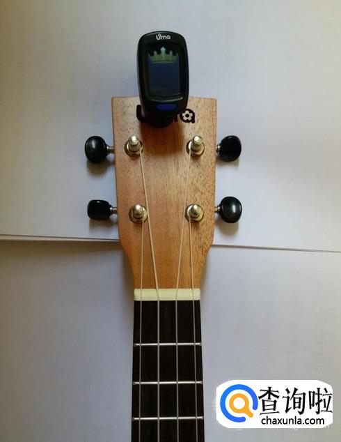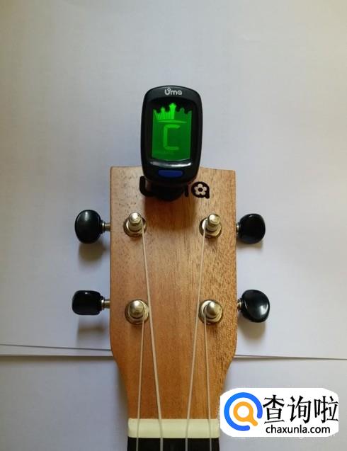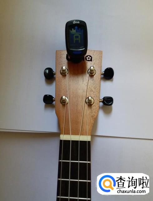 将调音器夹在尤克里里的琴头上。
