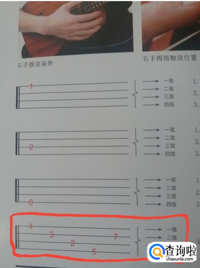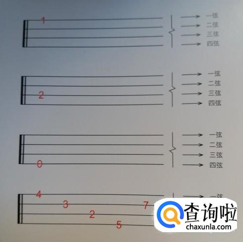 例如下图,依次拨响一弦4品,二弦3品,三弦2品,四弦5品,二弦7品。