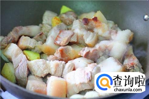 锅里加上一点油烧热,然后把葱姜放进去爆香,再把肉块放进锅里炒一炒,炒到肉块外表有些发硬。