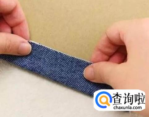 把裤口折叠成细条,用针线缝在包包的上端,当包的提把儿。