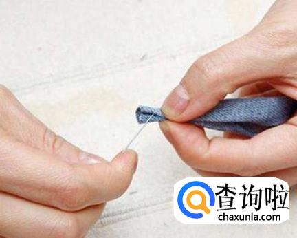用针线把牛仔裤的口袋缝死,再把裆部的布往上挽一段距离,然后用针线缝在一起,包体部分就缝好了。