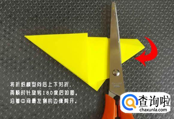将折纸模型向后上下对折,再顺时针旋转180度后如图。沿着中间最左侧的边缘剪开。