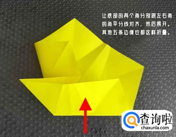 将底部边缘向上折叠,让底部的两个角分别跟左右角的角平分线对齐,然后展开。其他五条边缘也都这样折叠。