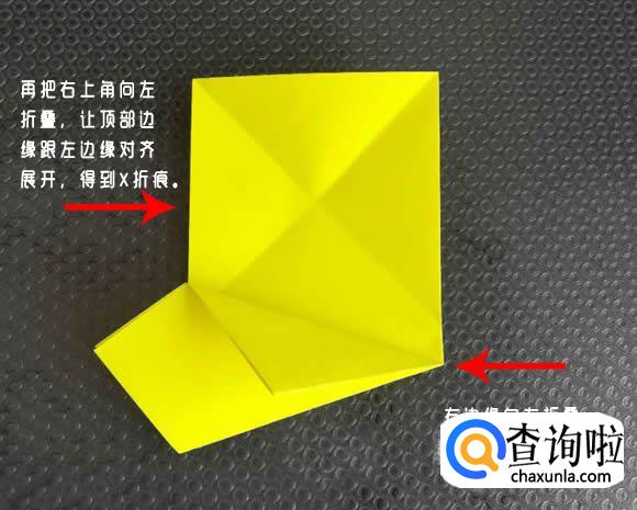 然后将左上角向右折叠,让顶部边缘跟右边缘对齐,展开。再把右上角向左折叠,让顶部边缘跟左边缘对齐,展开,得到X折痕。