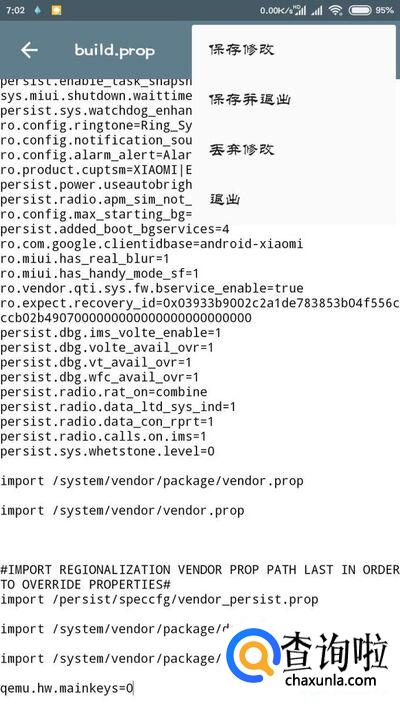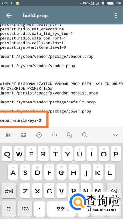 在最后一行插入qemu.hw.mainkeys=0,点击右上角保存修改并退出。