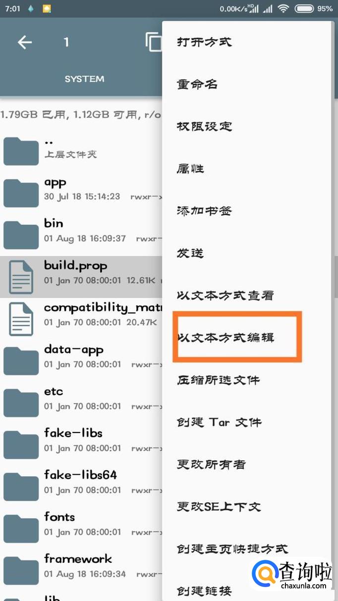 在根目录的system文件夹里面找到build.prop,长按后点击右上角的"文本方式编辑"。