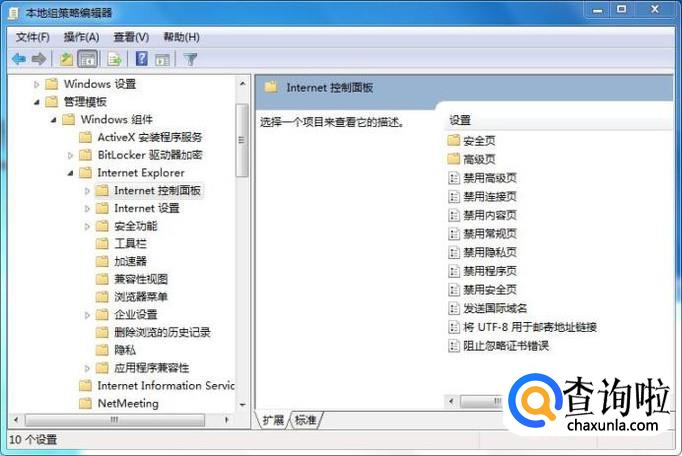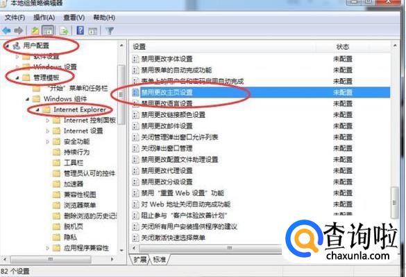 【用户配置--管理模板-- Windows组件-- Internet Explorer】,在右侧窗口中找到“禁用更改主页设置”,如下图所示: