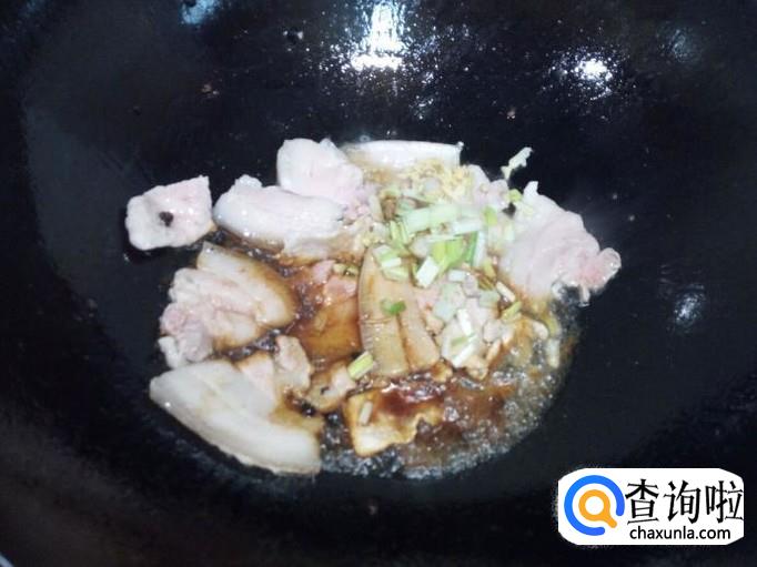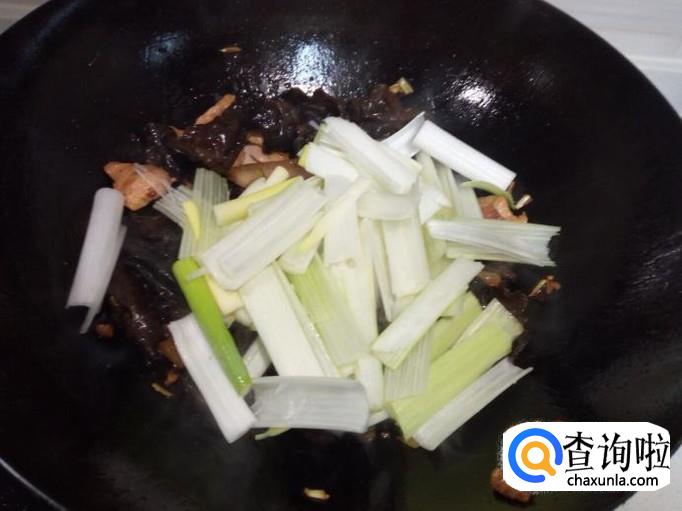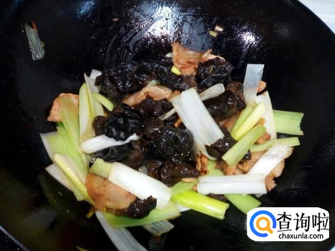 炒至肉片下油,颜色微白,放入料酒,酱油,葱,姜末,翻炒。随即放入木耳翻炒,放入盐。