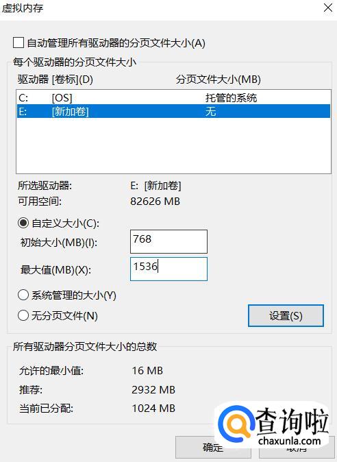 可以调整虚拟内存。依次点击:我的电脑、属性、高级、性能,设置、高级、更改。点击E盘自定义大小,初始大小768M,最大值1536M确定。重启电脑。