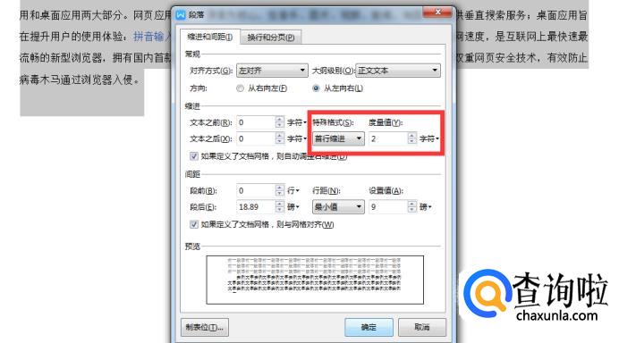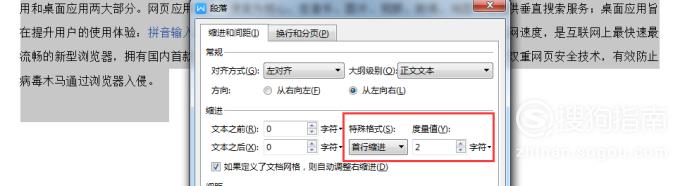 接着在<特殊格式>下选择<首行缩进>,度量值为2。