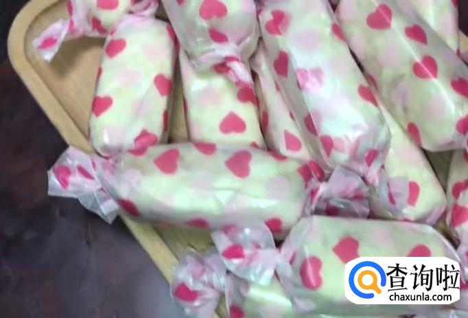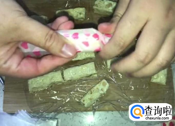 然后,拿出准备好的彩色糖纸,裹在牛轧糖外面,将两端扭成麻花状,全部包装好后,好吃的牛轧糖就做好了。