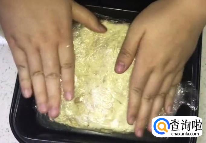 拿出准备好的方形盒子,铺上保鲜膜,将花生碎、棉花糖、奶粉和黄油的混合物倒在保鲜膜上,然后在混合物的表面盖上保鲜膜,用手隔着保鲜膜将混合物捏成盒子底部的形状。尽量捏得方正一点,方便后续将牛轧糖切成长条形。