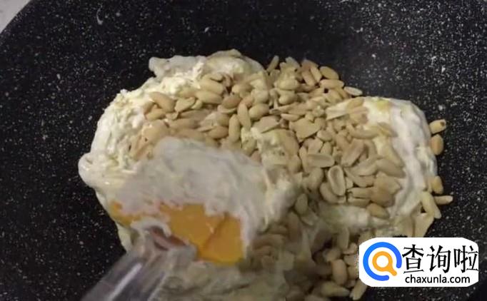 等奶粉和棉花糖、黄油混合后,先关火,再倒入花生碎,将花生碎搅拌进锅里。