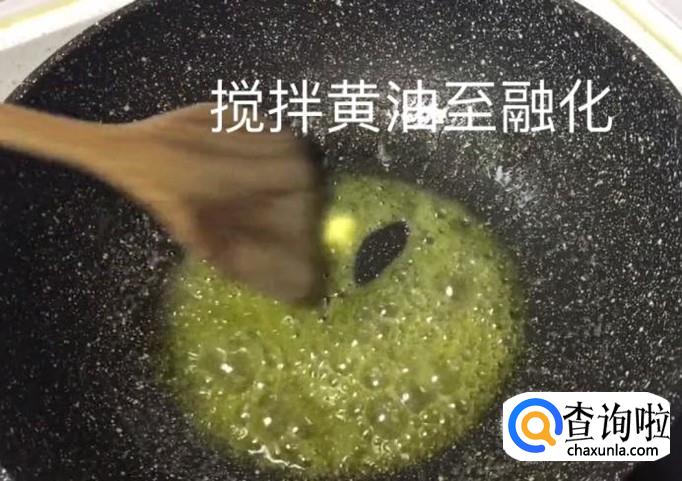 然后,将不沾锅烧热,放入准备好的黄油,用木勺子将黄油搅拌至融化。