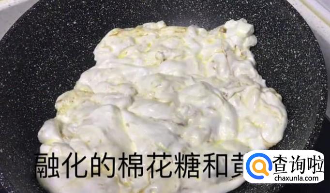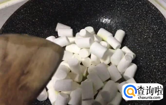 再将棉花糖倒在锅里,用木勺子搅拌至融化,将融化的棉花糖与融化的黄油充分混合。