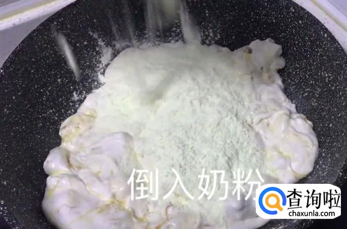 倒入奶粉,继续搅拌,直到奶粉与融化的棉花糖和黄油充分混合。