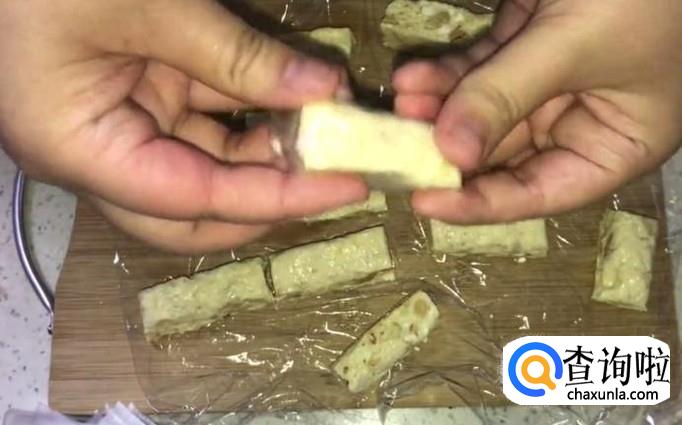 将捏好并冷却的牛轧糖放在菜板上,打开表面的保鲜膜,用菜刀将牛轧糖切成长条形,然后用糯米纸裹在每一块切好的牛轧糖上。如果没有糯米纸,可以在牛轧糖表面撒上一层奶粉,不仅包装牛轧糖时不沾手,还方便保存。