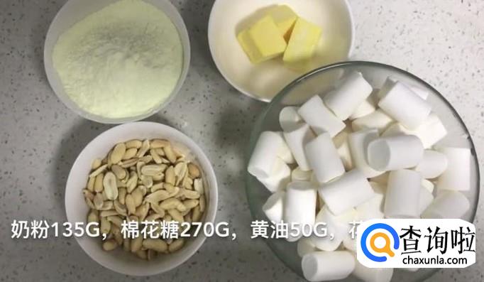 首先,准备135克的奶粉,270克的棉花糖,50克的黄油,100克的花生碎,用碗装起来备用。