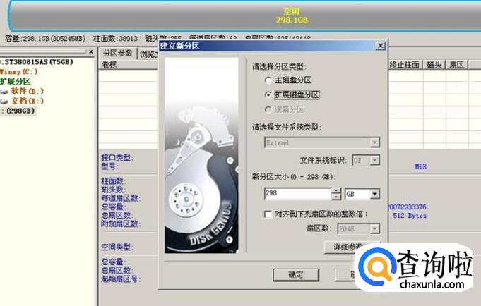 由于我们只把移动硬盘当存储盘用,所以分区类型选择“扩展磁盘分区”,下面的“新分区大小”就不需要再划分了,点下面的“确定”。