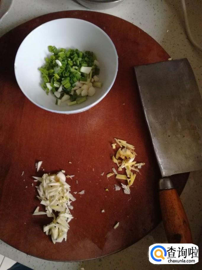 准备好各种佐料:盐、葱、老姜、蒜瓣、清油、砂仁果等。并将姜、蒜切丝备用,并将葱切成葱花状。