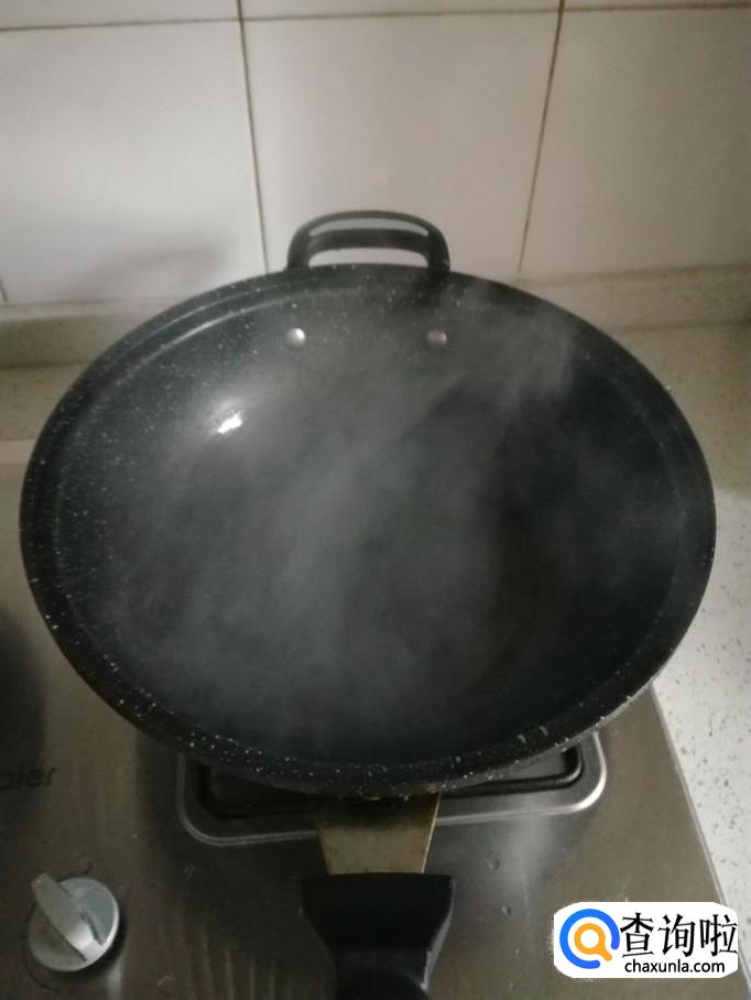 将锅用清水洗干净,大火烧干,然后倒上清油,转小火将锅烧滚。
