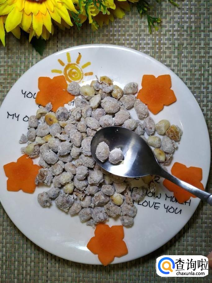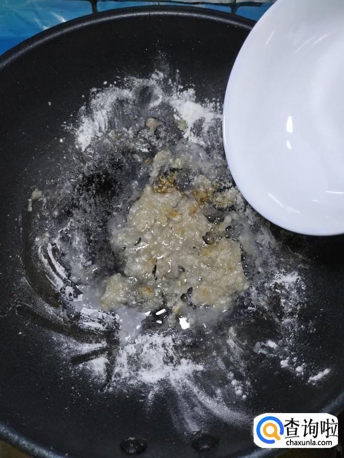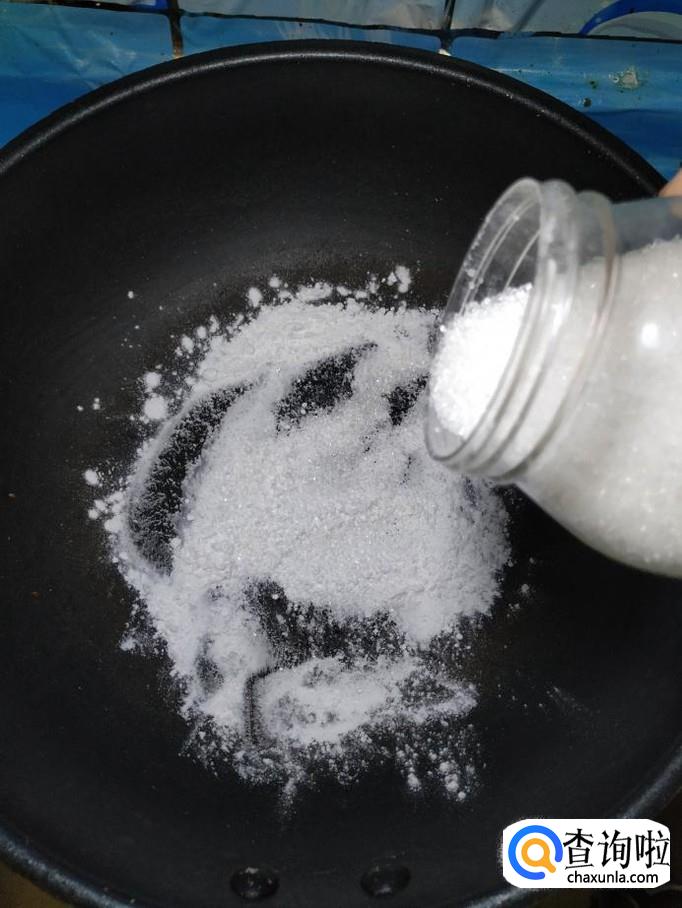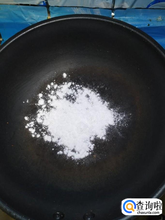 炒锅中放入适量淀粉,再放入适量白砂糖,加少许清水,淀粉,白砂糖和清水的比例是1:1:1。喜欢甜味的,可以多加入一些白砂糖。