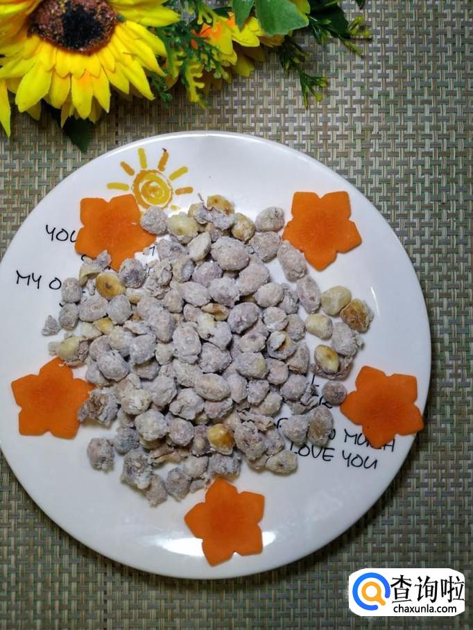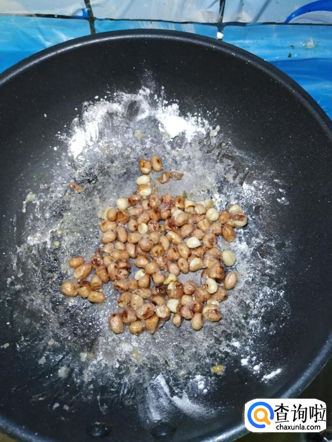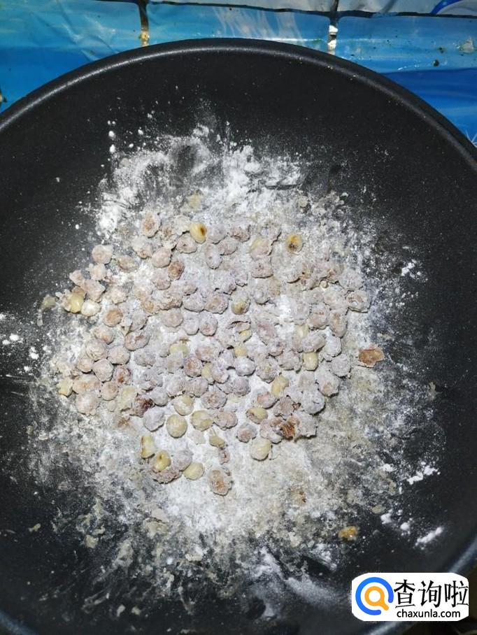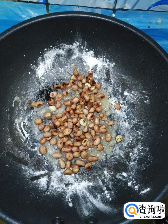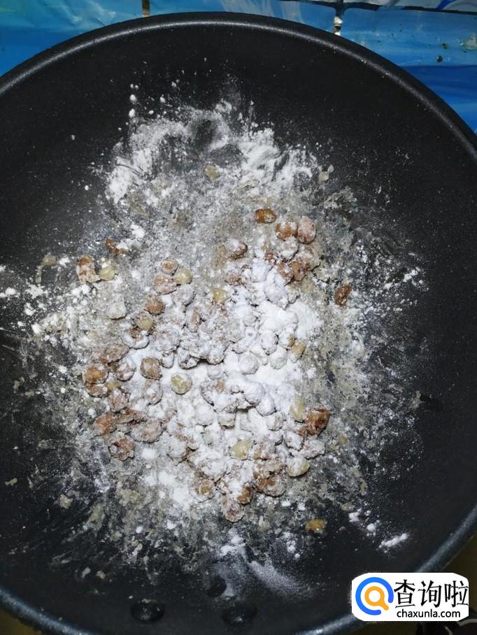 看到每一粒花生都沾上糖液之后,再撒入一些干淀粉。