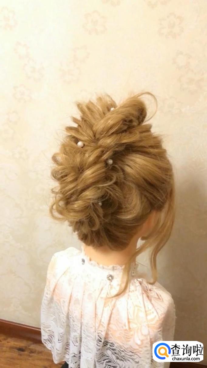 将头发轻轻扯出少许,营造自然蓬松感。最后将珍珠发饰装饰上就完成了!
