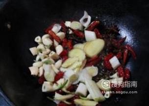 起锅烧油,油多一点,这样土豆片做出来才好吃。油热后放入蒜、姜、辣椒段小火煸炒,开大火辣椒容易炒焦。