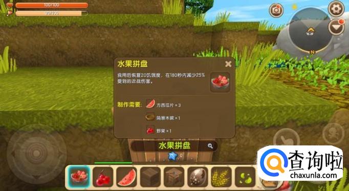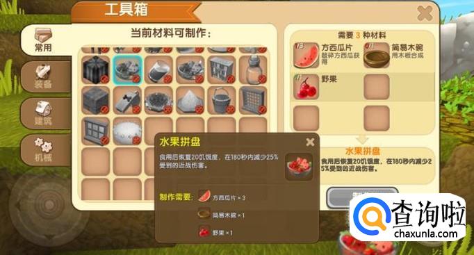 如图所示,水果拼盘是由方西瓜片、野果和简易木碗制作而成的,我们只需要分别获取采集这些原料,就可以合成水果拼盘了。