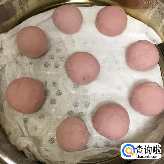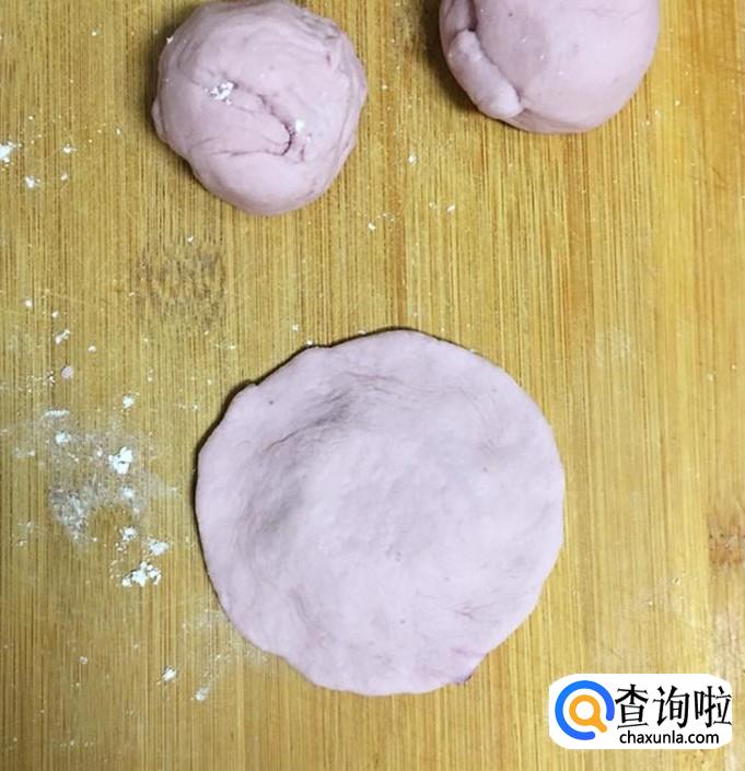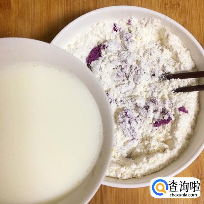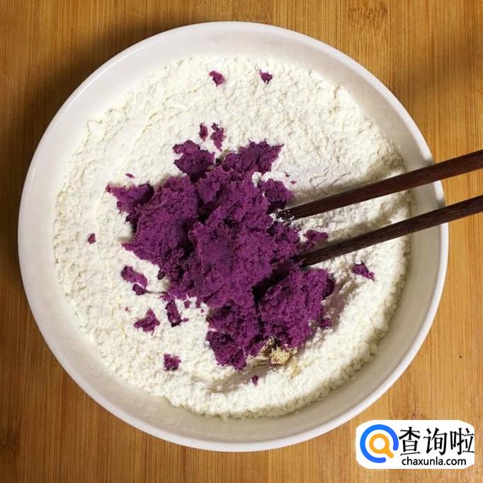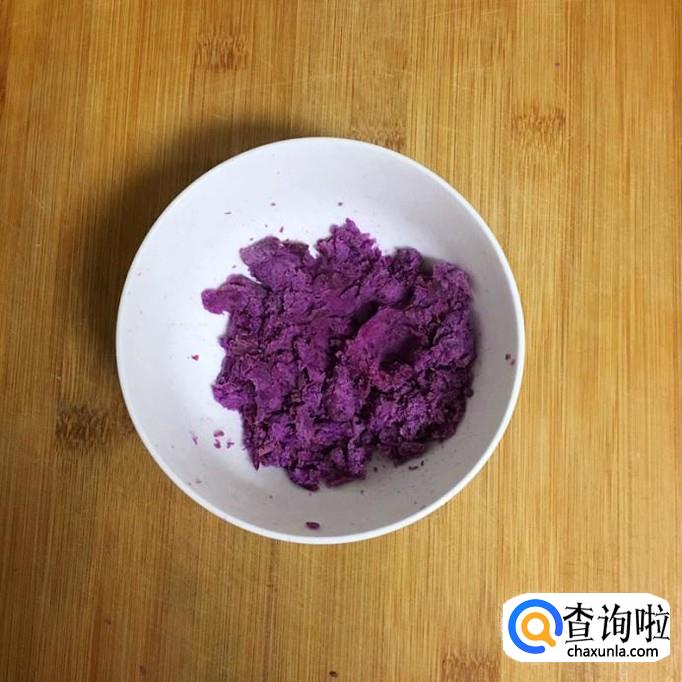 紫薯洗净后去皮,切成薄片上锅蒸熟,然后趁热用勺子压成紫薯泥。