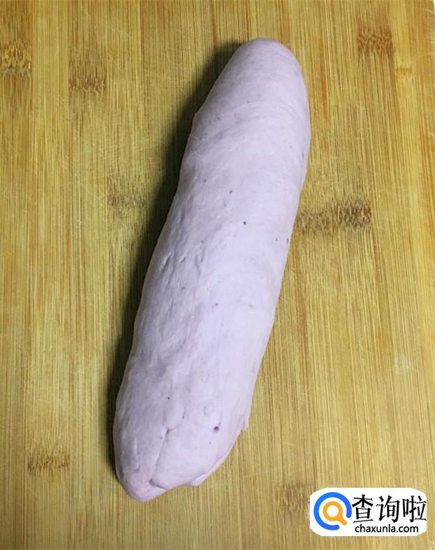 把发酵好的紫薯面团再次揉匀,并整成一个长长的圆柱形,然后分割成若干个小段。