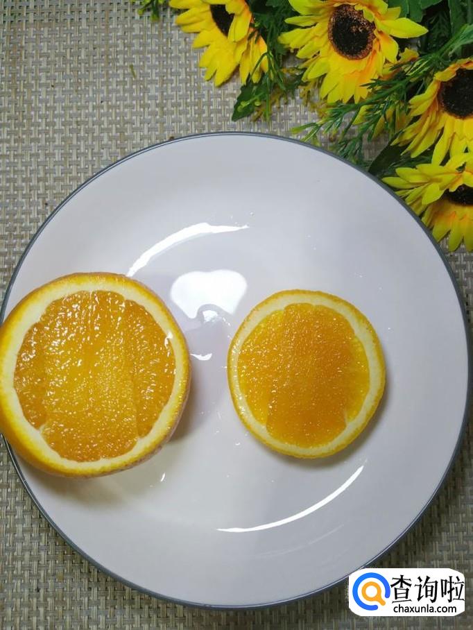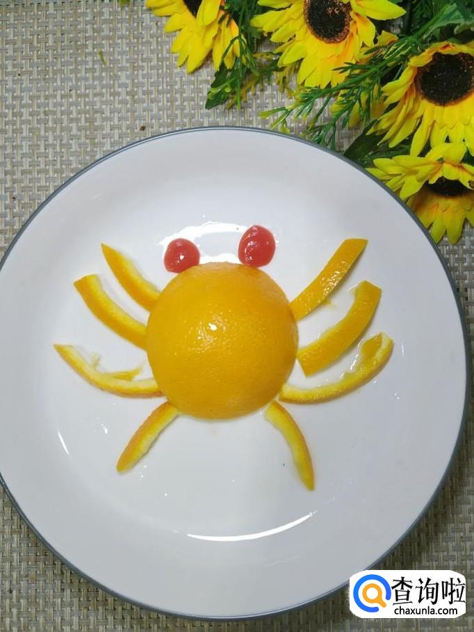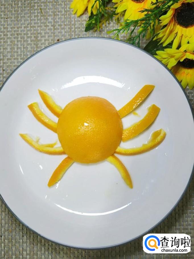 将橙子侧放,然后用刀将橙子在四分之一处切开,然后平面向下,放在盘中,做螃蟹的背部。再用橙子皮剪出八条细长一点弧线,如图所示,摆放一下,做成螃蟹的八条腿。