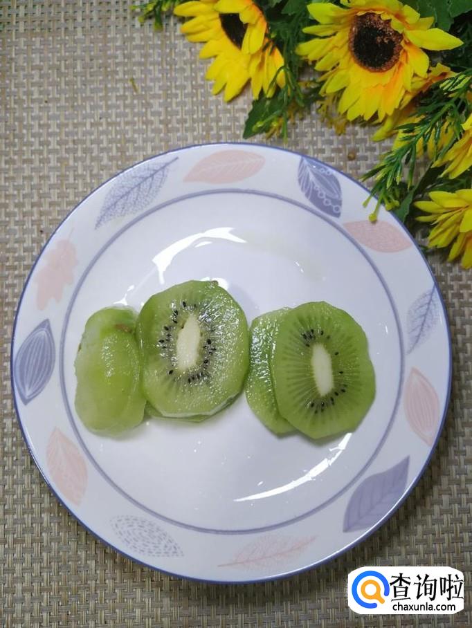 将猕猴桃去除外皮,然后切成片儿,再对半切开,摆在盘子的最下方,做成水草的样子,螃蟹是在水里游的动物。