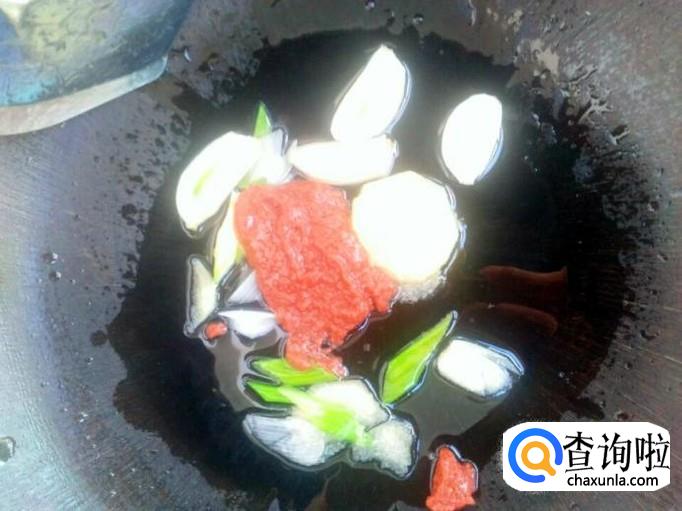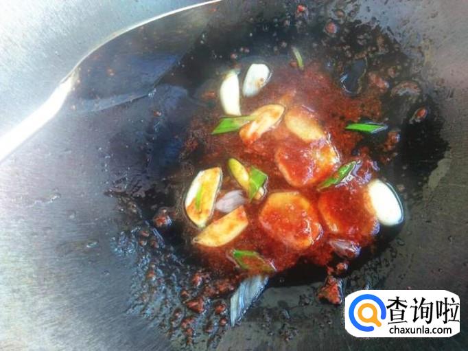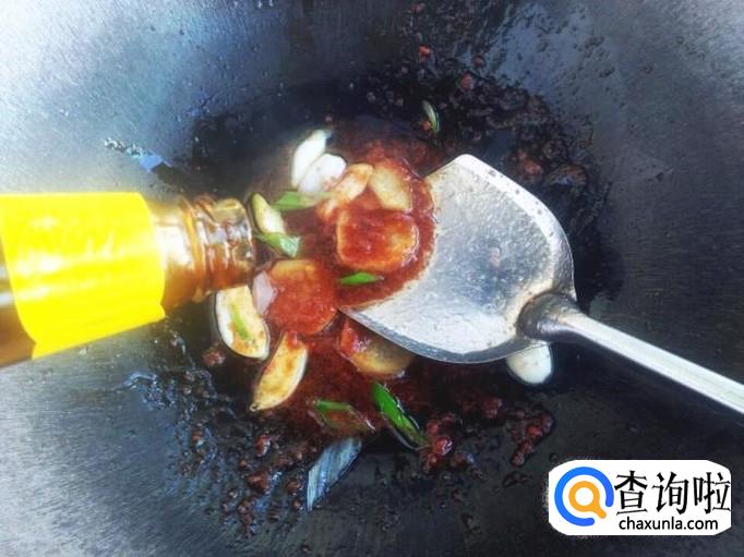 调小火,将蟹籽酱放进去,一定要小火,然后翻炒几下。